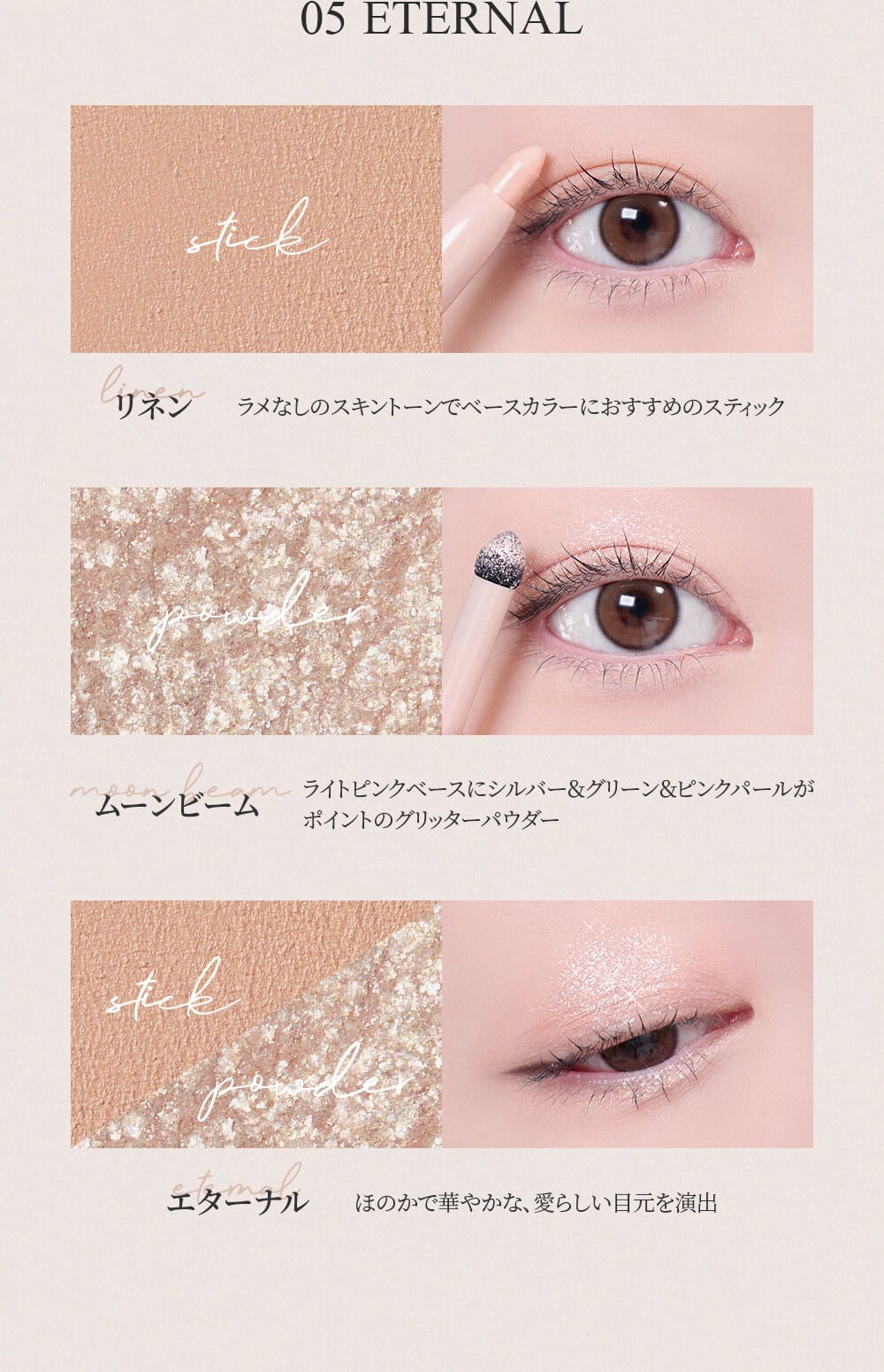 ほのかで華やかな、愛らしい目元を演出。ラメなしのスキントーンでベースカラーにおすすめのスティック。ムーンビーム/ライトピンクベースにシルバー&グリーン&ピンクパールがポイントのグリッターパウダー。