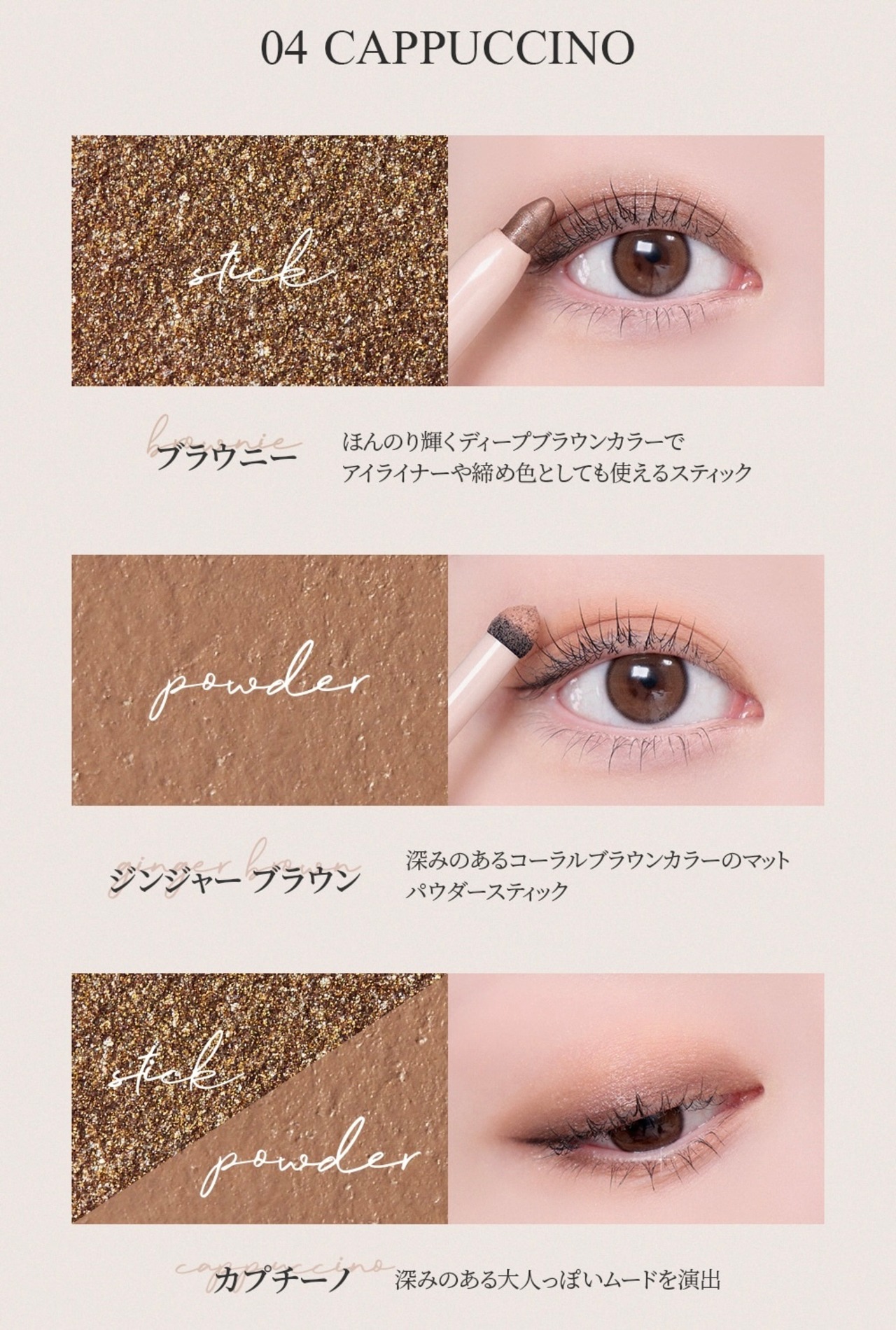 深みのある大人っぽいムードを演出。ブラウニーほんのり輝くディープブラウンカラーでアイライナーや締め色としても使えるスティック。ジンジャーブラウン深みのあるコーラルブラウンカラーのマットパウダースティック。