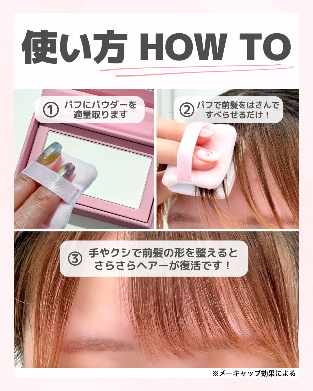 ②前髪の生え際をパフではさみ、毛先に向かってすべらせるようにしてなじませます。