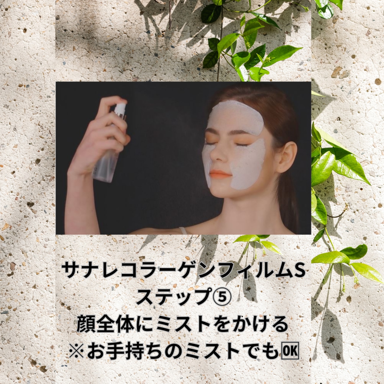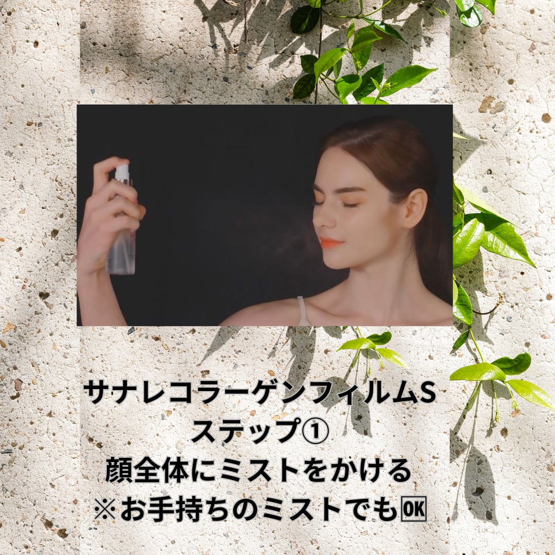 4.目をつぶって、専用のコラーゲンミストなどを噴射してください。皮膚美容成分を含むコラーゲンフィルムが皮膚に溶けて吸い込まれます。(手でこすらなくてよいです)